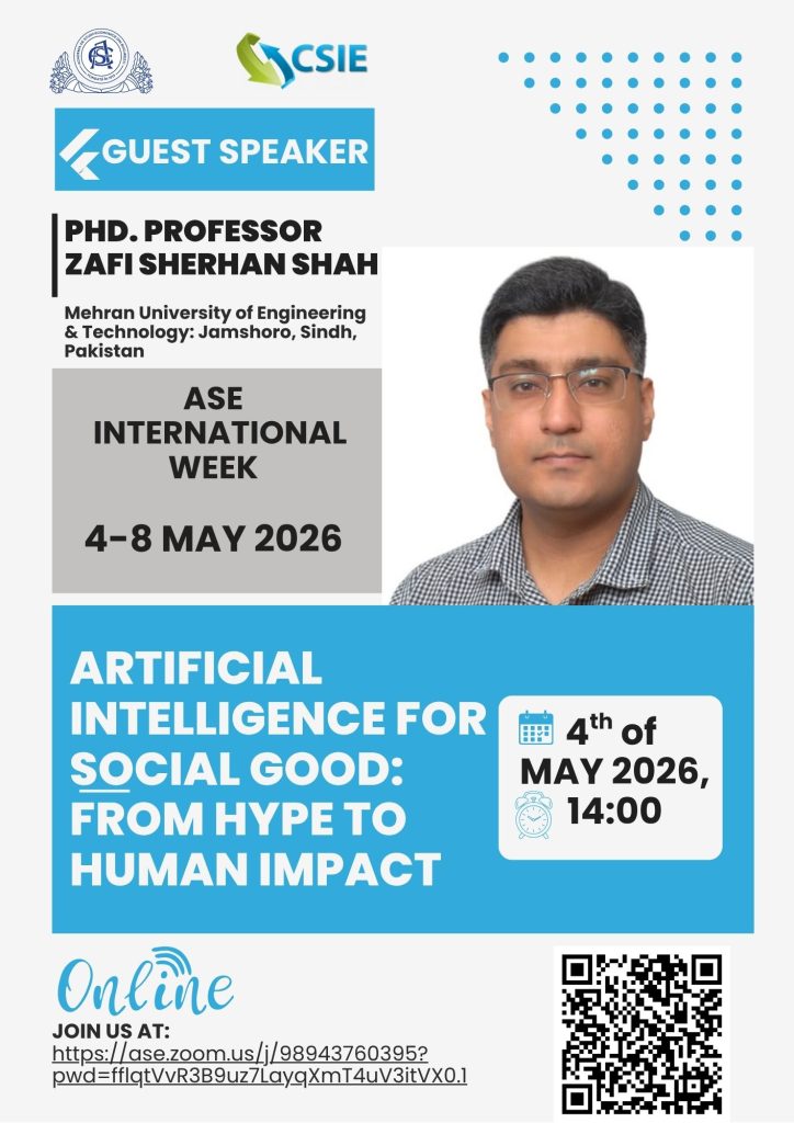 În cadrul Săptămânii Internaționale ASE, Facultatea de Cibernetică, Statistică și Informatică Economică (CSIE) va găzdui luni, 4 mai 2026, în intervalul 14:00–15:00, evenimentul online „Artificial Intelligence for Social Good: From Hype to Human Impact”, susținut de dl. prof. Zafi Sherhan Shah (Mehran University of Engineering & Technology, Jamshoro, Sindh, Pakistan).