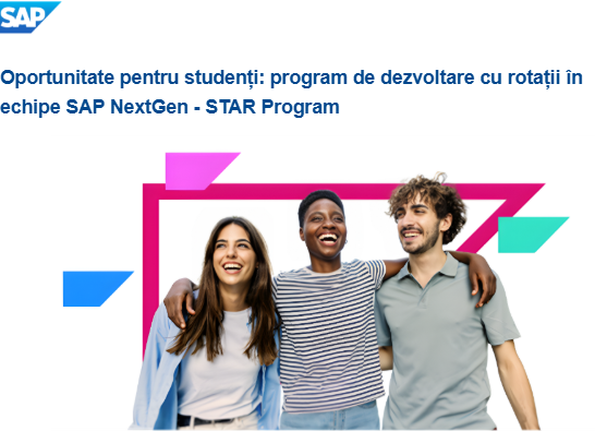 Ne face o deosebită plăcere să vă anunțăm lansarea oficială a programului STAR (Student Training and Rotation Program), parte din organizația SAP NextGen. Cu această ocazie, SAP România deschide, în cohorta ce debutează în martie 2026, 10 poziții dedicate studenților universităților partenere din România.