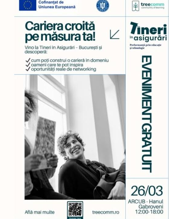 Evenimentul „Tineri în Asigurări” va avea loc în data de 26 martie 2026, între orele 12:00 – 18:00, la ARCUB – Hanul Gabroveni, București, și este dedicat tinerilor interesați să descopere oportunitățile de dezvoltare profesională din domeniul financiar și al asigurărilor.